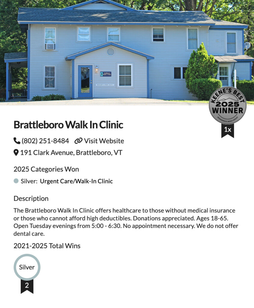 November, 2025: We are proud to learn that the Brattleboro Walk-In Clinic is Keene’s Best’s 2025 Urgent Care/Walk-In Clinic Silver Award Winner (for the second year in a row)!